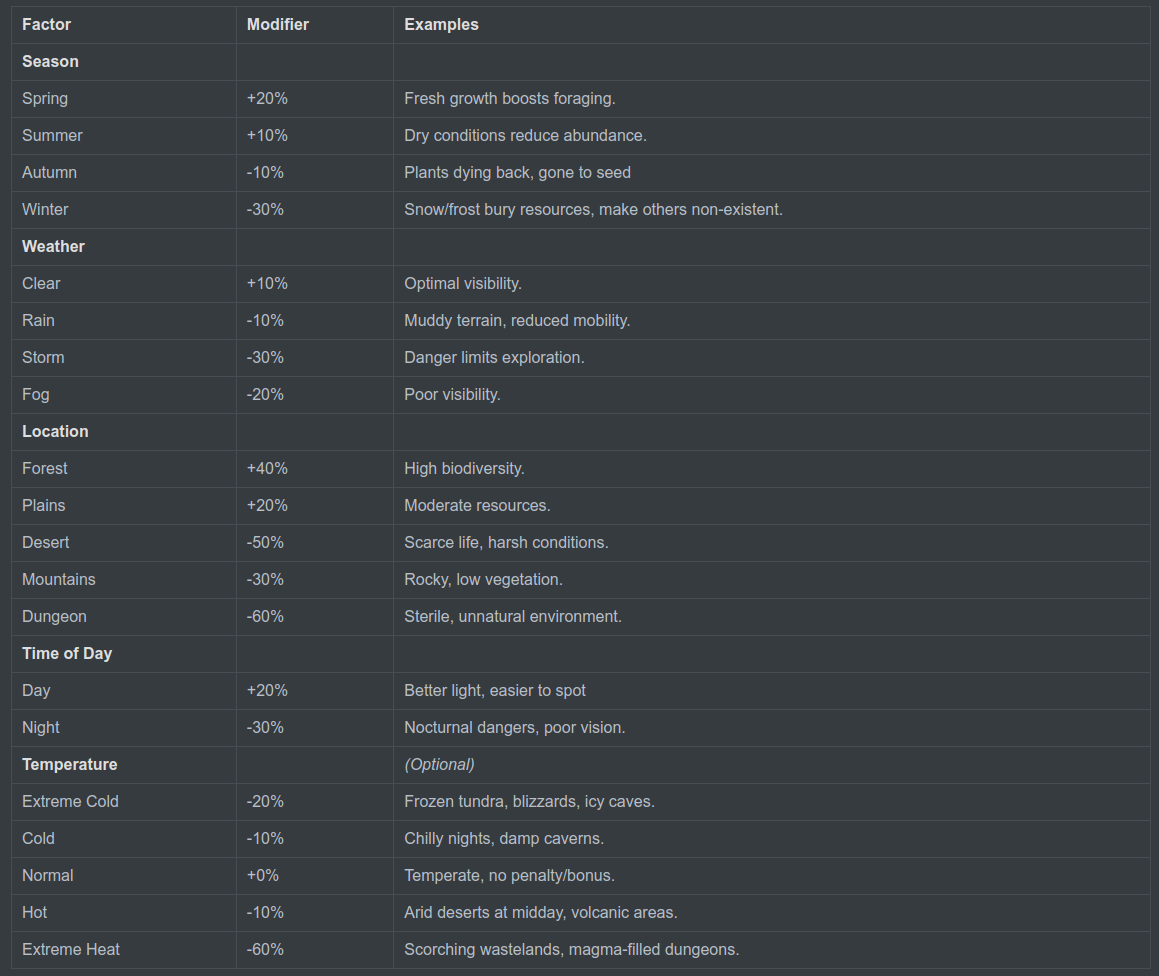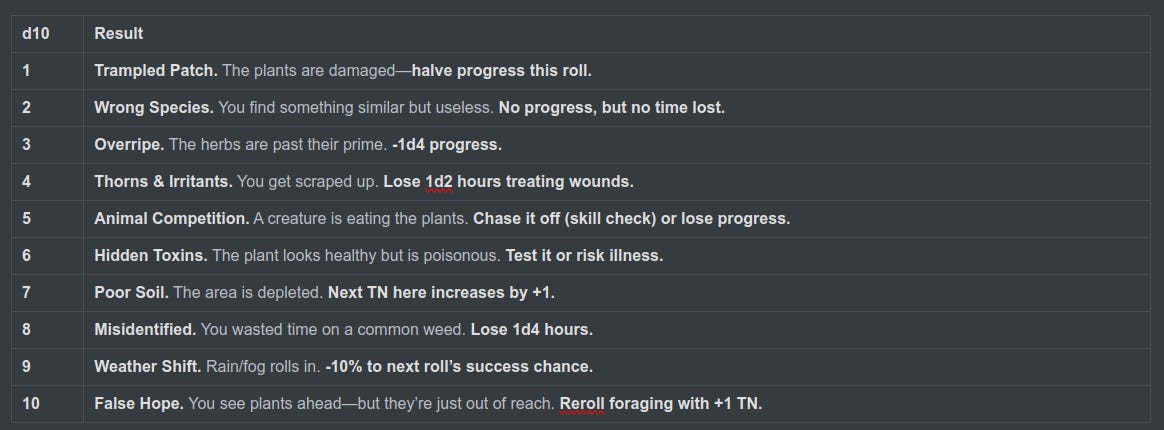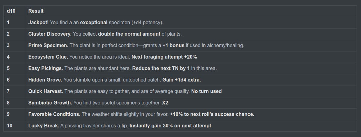 So, I've attempted to create a structured foraging mechanic, incorporating dynamic probability, dice-based risk/reward, sprinkled with complications.