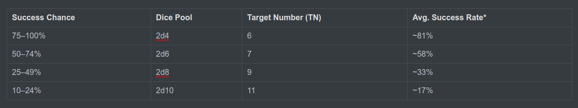Dice Pool: 60% falls in the 50–74% range → 2d6 (TN 7)