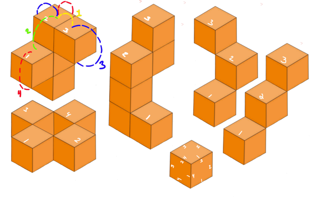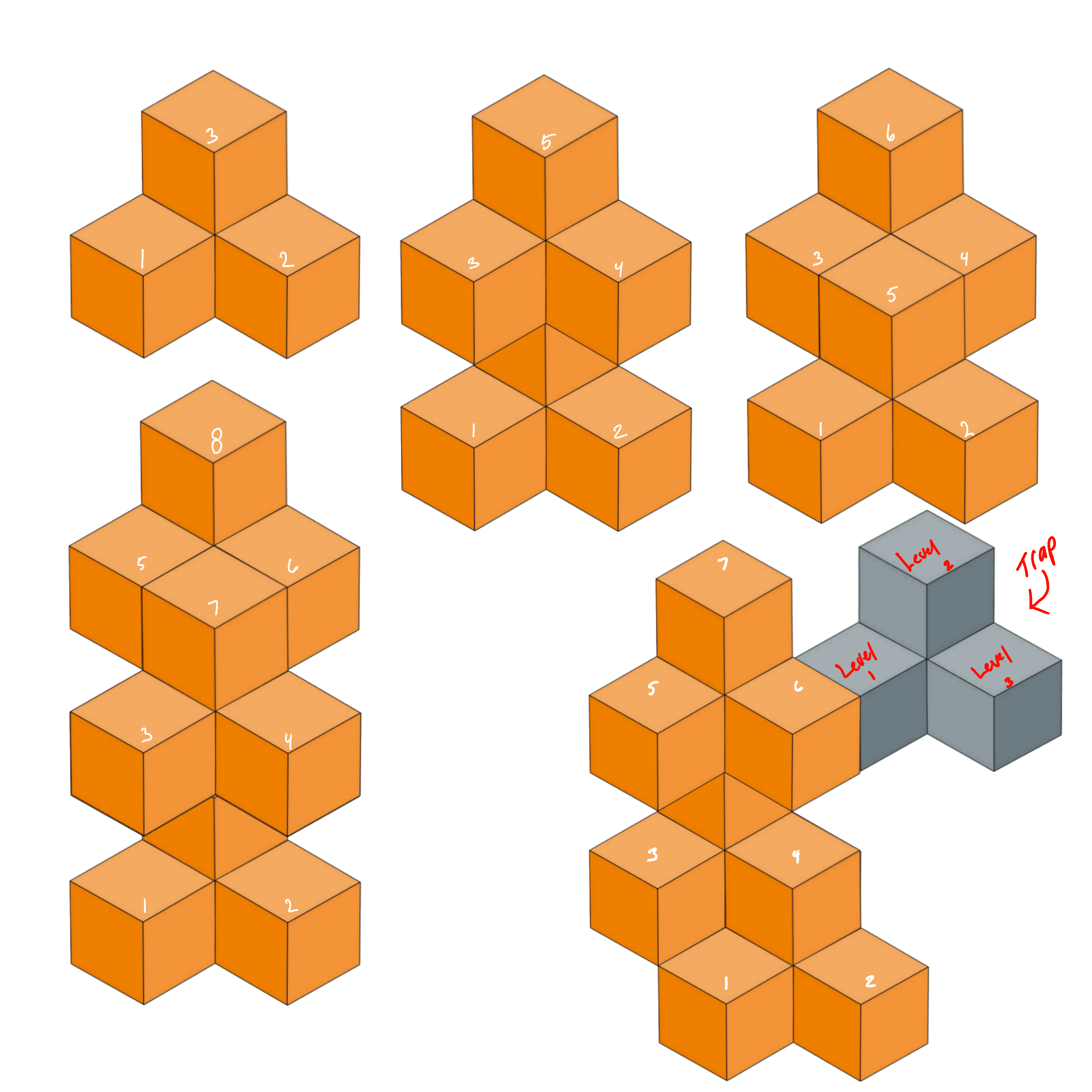 Each numbered cube represents a tumbler that must be set before the lock can be fully opened. Movement can dice based (d4’s), or manual. I find either works depending on your personal tastes and needs, however, dice based movement adds a level of difficulty to more complex looking locks like those above.