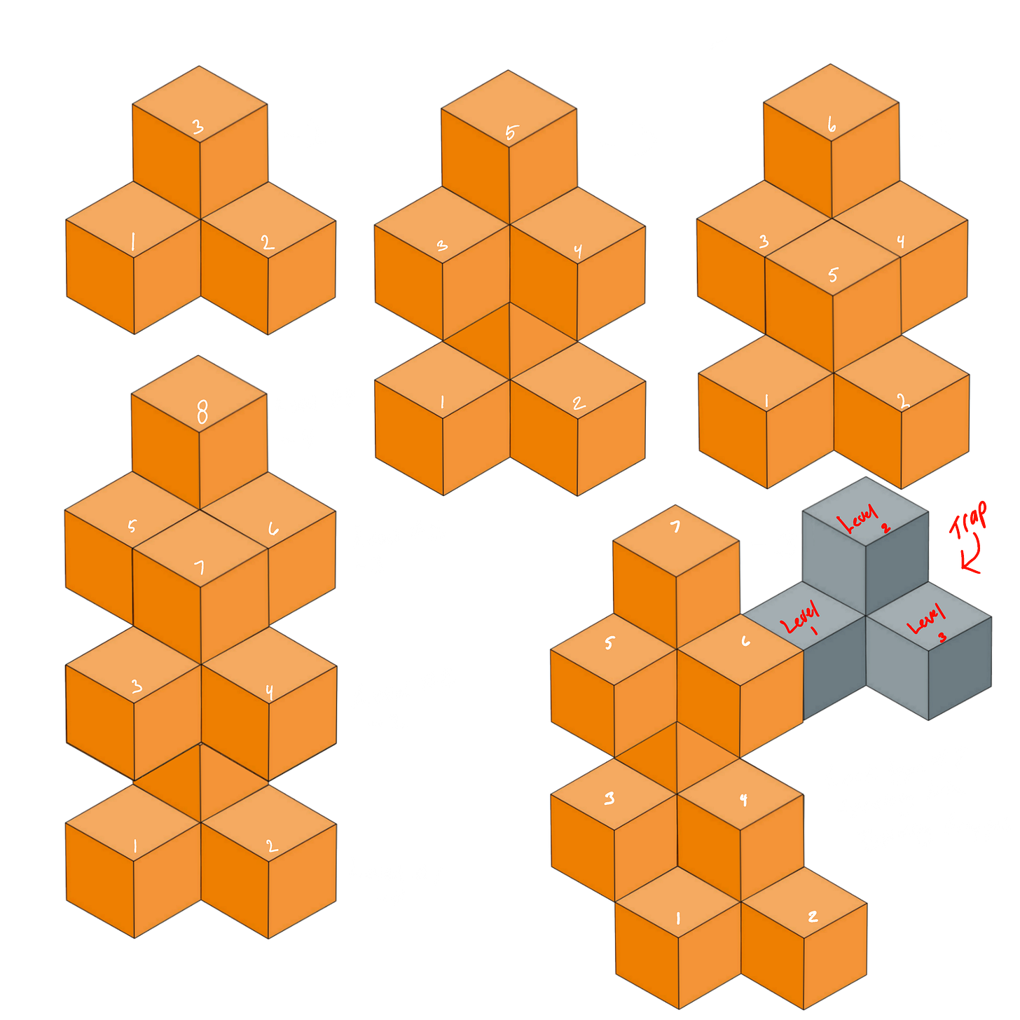As a reminder, a cube map is an abstract representation of any given space, real or not, known or unknown. In this case, that abstract space happens to be the inside of a lock and maps out the locks tumblers. Below are some examples of lock designs, of varying degree, including one example with a trap.