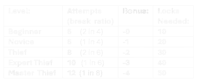 Note the ‘Break Ratio’ (BR) is the chance of a lock pick breaking after the number of attempts are made. For example, a Novice player, after 6 uses of a single lock pick, there is a 1 in 6 chance of it breaking, i.e. a roll of 1 on a 6-sided die. A player can get up to a +5 bonus, however, it’s possible only through more expensive lock picks used on more challenging locks.