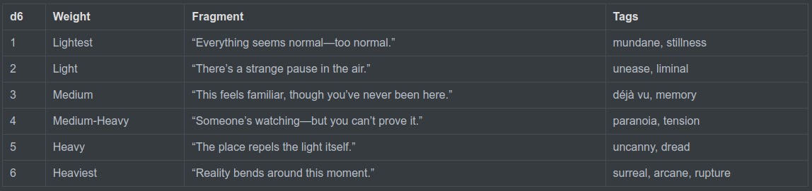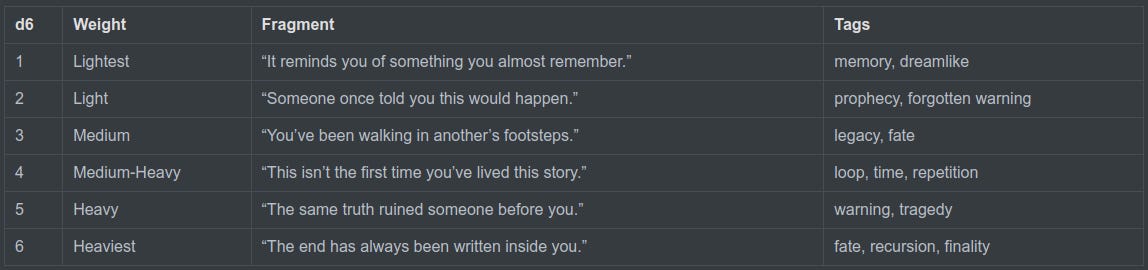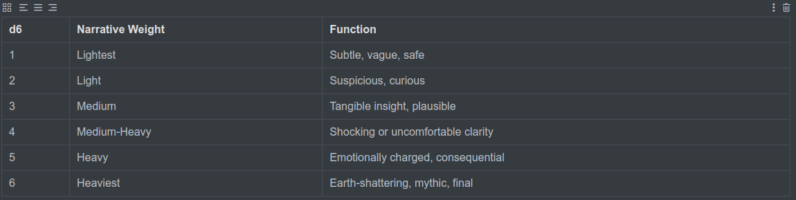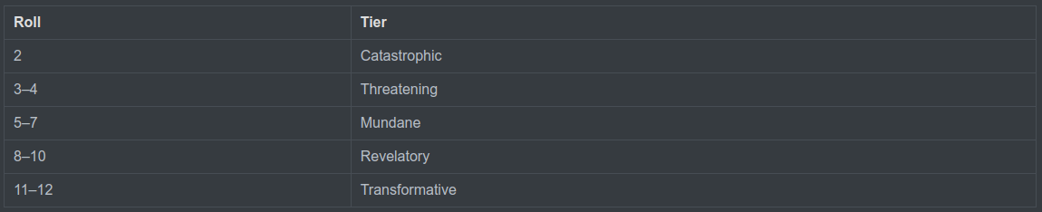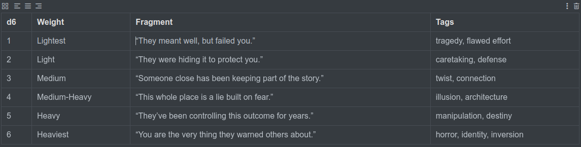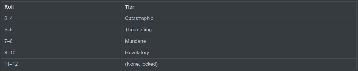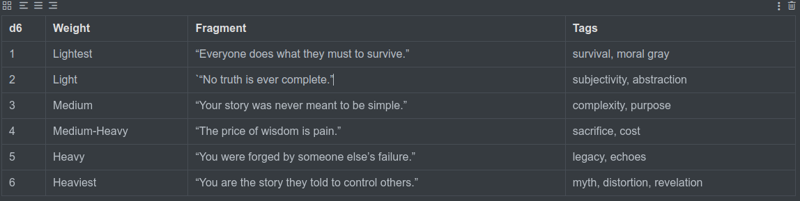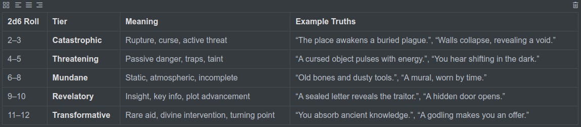 Once you determine the Tier via the adjusted 2d6 roll. Pick a truth fragment from that tier’s array or roll on a matching Truth Table stage (Revelation or Meaning). This turns your rolls into a living current of evolving story logic.