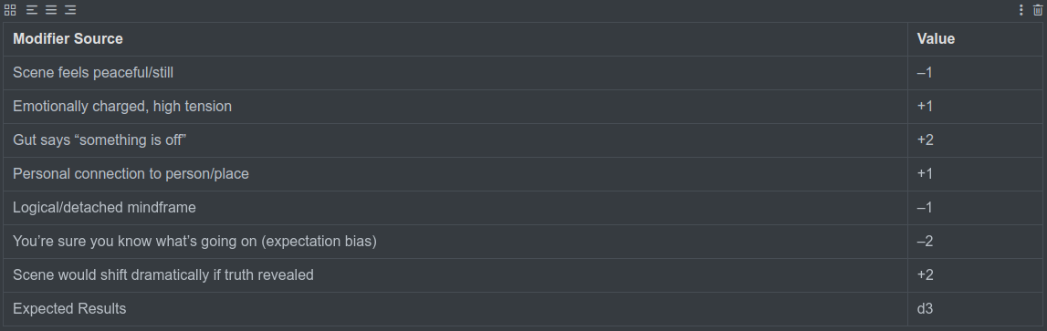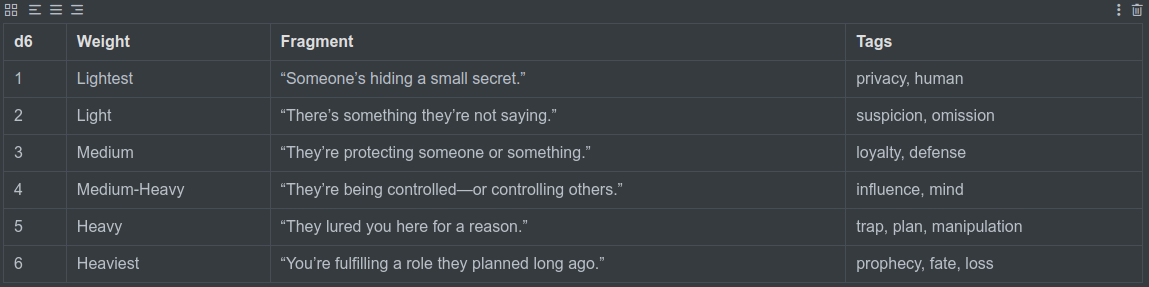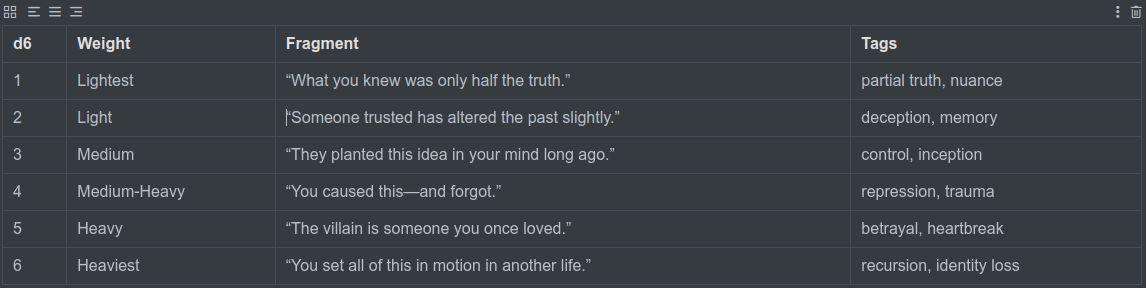 “Truth Tables” are rollable structures that withhold, evolve, or distort information, only revealing the full truth over time or under specific conditions. Think of it like narrative archaeology—uncovering a story layer by layer.