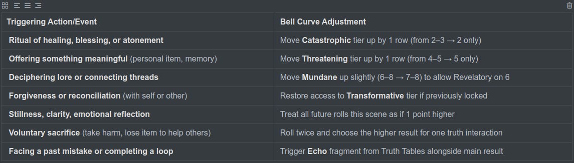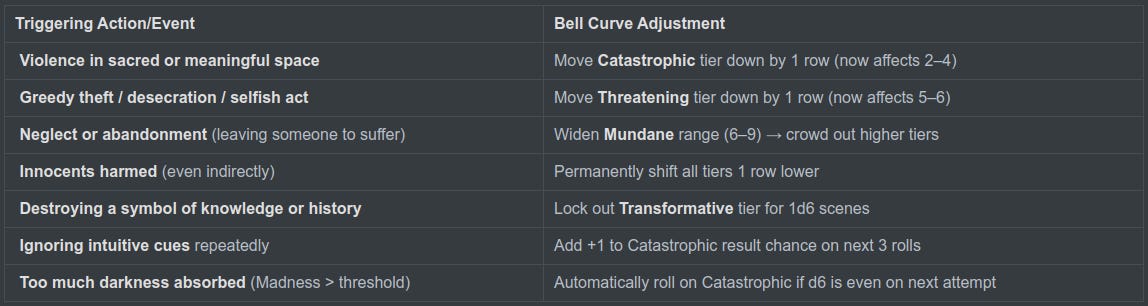 This is where the mechanic evolves based on story behavior. Shifting results downward reflects taint, consequence, entropy. Shifting upward reflects growth, clarity, or purification.
