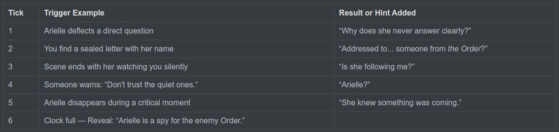 Because this is getting really long, I’m just going to cover Bloom Clocks briefly, and then get more into them in a Part 2 that I will put out in a day or two. For now, let’s take a quick look at Truth Bloom Clocks, which are countdown mechanisms that “unlock” deeper truths only after enough context, tension, or clues have accumulated. Until the clock is full, the truth is hidden, partial, or misleading.