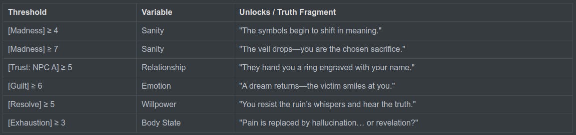 Variable: A character trait, narrative tag, or emotional state (Madness, Guilt, Trust, Resolve) Threshold: A numerical or qualitative requirement (Madness ≥ 6) And finally, Truth Options: Either a table array, a stage from the main Truth Table, or a specific event fragment.