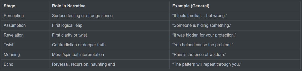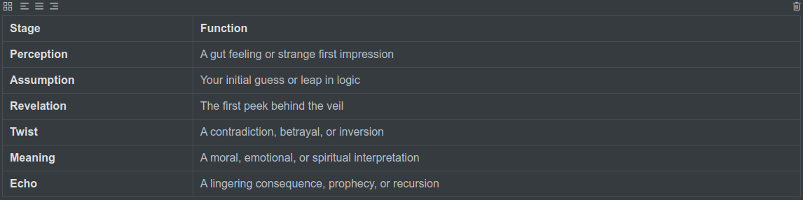 This system is designed to work across NPCs, locations, memories, prophecies, relationships, or even a player’s own evolving identity. It assumes truth is fragmented and revealed over time via six defined narrative stages. Each stage plays a distinct role in the unfolding of a mystery or revelation.