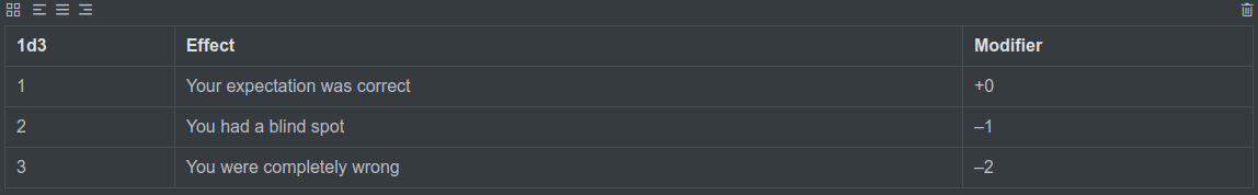 If the player expects a certain result, roll 1d3 to determine narrative surprise. Use the proper Truth Table below, only pick your expected result. Then roll a d3 to see if you were correct.
