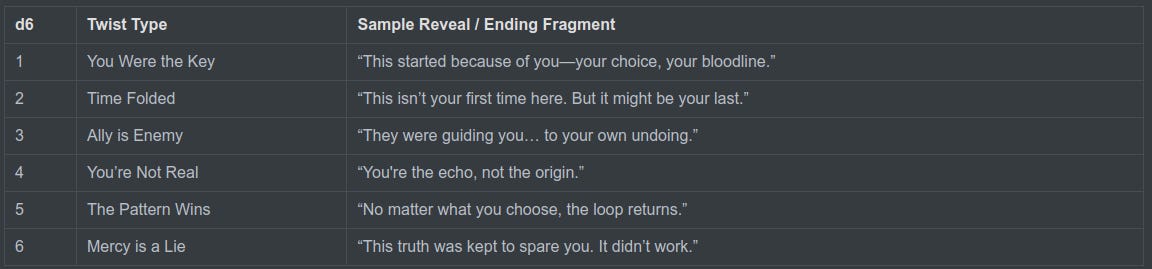 Here are three sample Truth Bloom Clocks designed for narrative flexibility and to spark rich, layered reveals during solo play. Each one includes suggested tick triggers, a final reveal payload, and optional integration with your Truth Table system (layering in Twist or Echo fragments). Following these is a generator to help you create your own Truth Bloom Clocks.