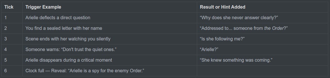 Truth Bloom Clocks, which are countdown mechanisms that “unlock” deeper truths only after enough context, tension, or clues have accumulated. Until the clock is full, the truth is hidden, partial, or misleading.