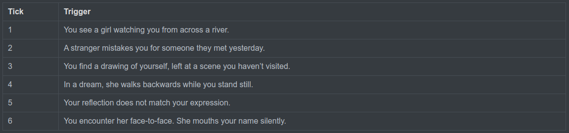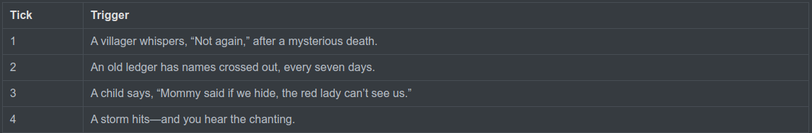 Theme: Somethings wrong with this quiet town. It’s too clean. Too still. Segments: 6 Tick Triggers: