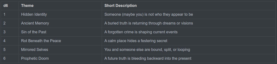 You can roll a d6 or pick intuitively. Each table cross-references the others for narrative cohesion.