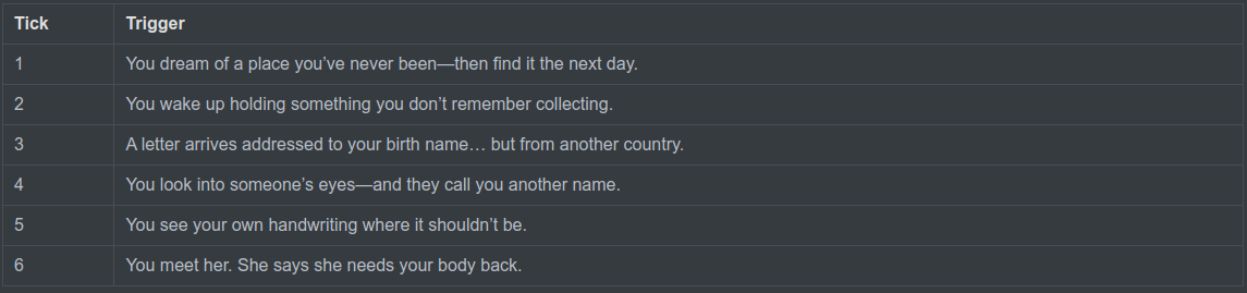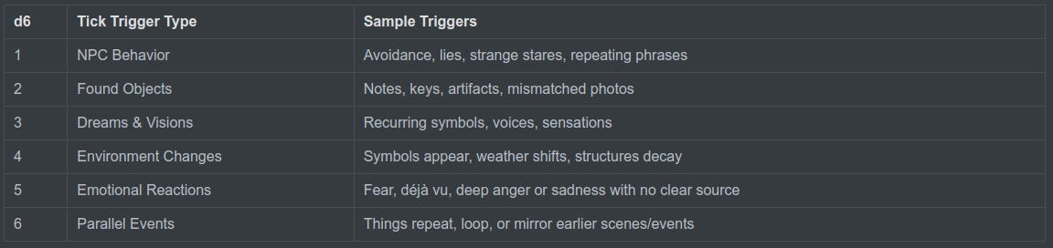 Choose 3–6 tick types based on your story pace. You can roll d6 or mix and match:
