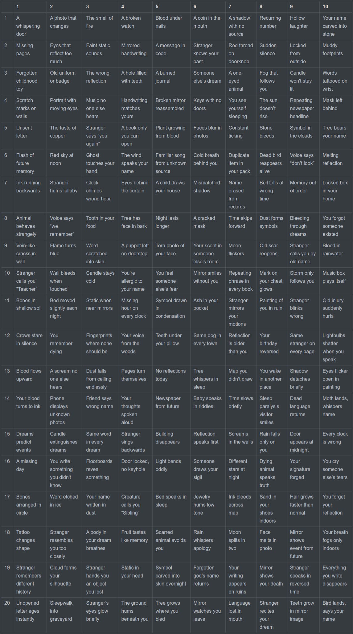 Finally, here's an expansive and flexible 10 × 20 matrix table of narrative trigger keywords designed specifically to fuel Truth Bloom Clocks and solo TTRPG storytelling. Each cell offers a unique idea fragment, symbol, or prompt that can: