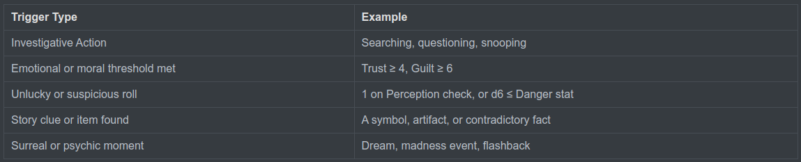 There are a variety of ways to interpret the Trigger Types so don’t think too much about them, if it feels like something matches up, go with it. You can always change your mind later and think of it as a ‘false trigger’. False triggers add depth and misdirection, so throw one in there any time a trigger is not turning out for you.